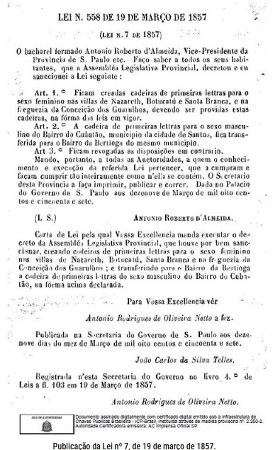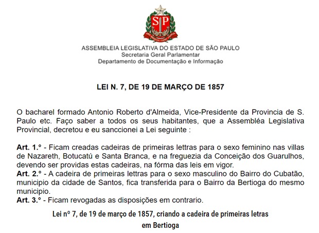 Através da Lei nº 7, de 19 de março de 1857, a cadeira de primeiras letras do bairro de Cubatão, em Santos, era transferida para Bertioga. Assim, a Vila de Bertioga passou a contar com uma cadeira de primeiras letras. Isso significa dizer que seria designado um professor. Mais tarde, pela Lei nº 2, de 14 de fevereiro de 1859 foi restabelecida a cadeira de primeiras letras em Cubatão, conservando-se a criada em Bertioga.