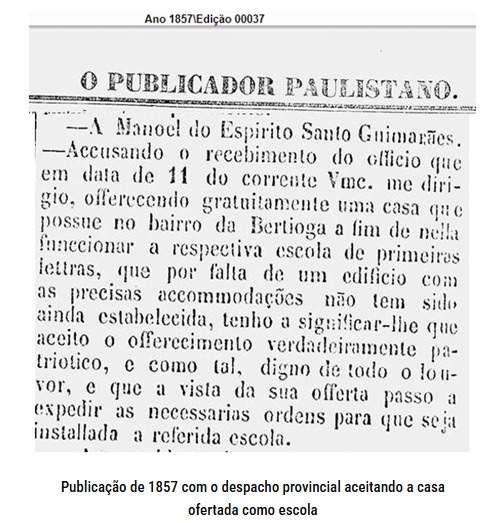 Manoel do Espírito Santo Guimarães ofereceu sua casa em Bertioga para que funcionasse como escola. Evidentemente que, em 1857, não haveria condições de ser construída uma casa para ser destinada exclusivamente ao ensino. A educação das crianças ocorria no quintal das casas, em suas dependências externas ou em alguma sala de estar improvisada para um certo número de meninos da Vila de Bertioga.