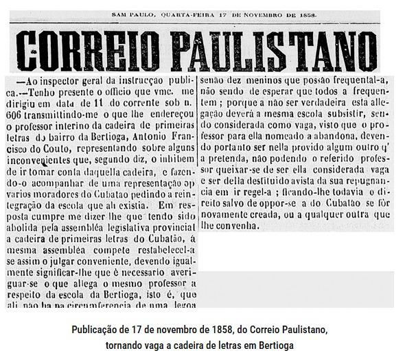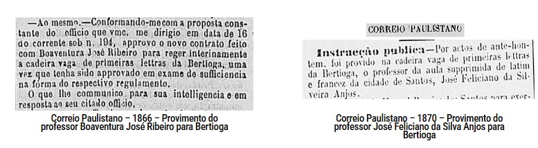 Em 1866 o “Correio Paulistano” publicou a designação do professor Boaventura José Ribeiro para a cadeira de primeiras letras em Bertioga. Em 1870 é designado José Feliciano da Silva Anjos.