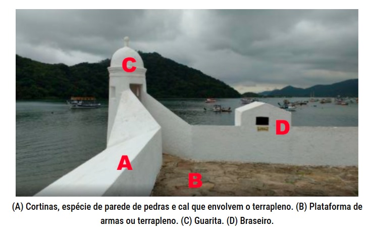 a) o terrapleno, também chamado de plataforma de armas ou baluarte, é a estrutura retangular de pedras, armada com canhões, e com as duas guaritas;