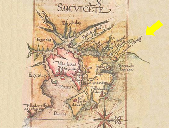 Mapa de São Vicente, de Luis Teixeira, de 1574. Detalhe para a Fortaleza de S. Thiago (Forte São Thiago/Forte São João).