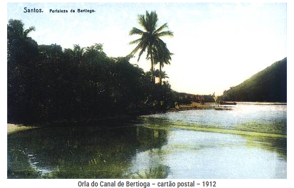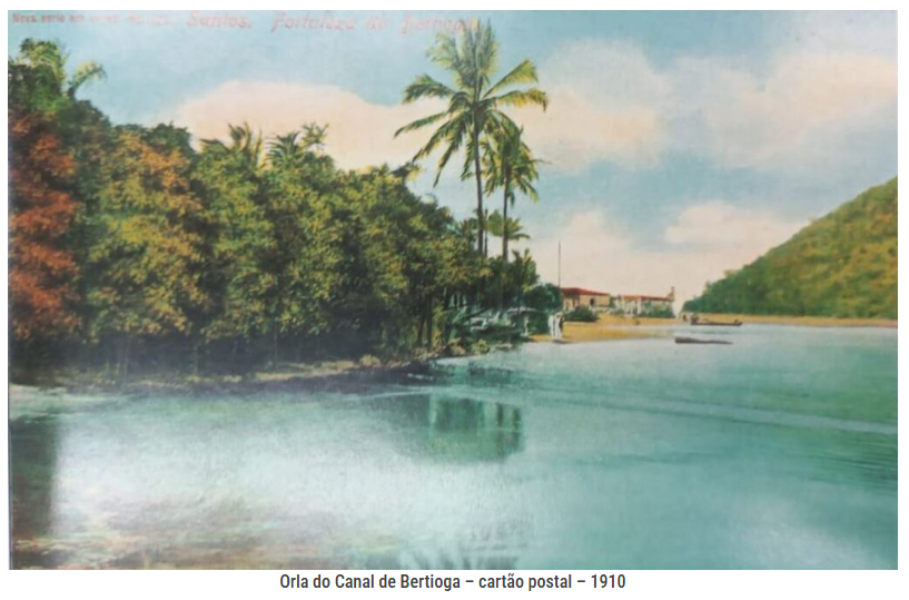 Cartão postal de 1919 mostra a orla do Canal de Bertioga ainda com sua vegetação rasteira e as canoas, algumas abandonadas, apodrecendo, outras aguardando a próxima pescaria: