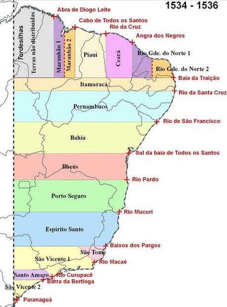 Segundo o site “Brasil Escola”, considerando o território português no Brasil estabelecido pelo Tratado de Tordesilhas, as “capitanias hereditárias” consistiam basicamente na divisão do território em 15 faixas de terra, que seriam entregues a portugueses responsáveis pelo povoamento da capitania, além do seu desenvolvimento econômico. Esse modelo das capitanias foi utilizado pela Coroa Portuguesa em algumas de suas ilhas atlânticas (Açores e Cabo Verde) e, como havia tido sucesso lá, os portugueses optaram por implantá-lo no Brasil.