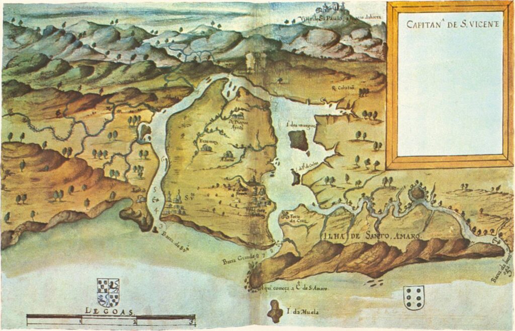 Mapa indicando no centro da imagem o limite entre a Capitania de São Vicente e a Capitania de Santo Amaro. Além disso, do lado direito, na extremidade da imagem, indica a Barra da Bertioga dentro da Capitania de Santo Amaro. Desenhado em 1631 por João Teixeira Albernás.