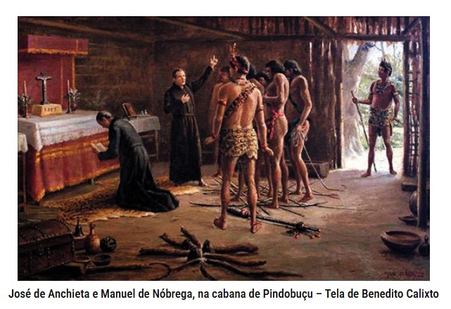 Em 1549, a “Companhia de Jesus”, por ordem de Ignacio de Loyola, envia ao Brasil os padres “jesuítas” Manoel da Nóbrega e José de Anchieta, com a missão de converter os indígenas aos ensinamentos cristãos (catequese), para que o trabalho escravo fosse substituído pelo trabalho voluntário. Por isso, a missão dos “jesuítas” tinha apoio da Coroa Portuguesa.