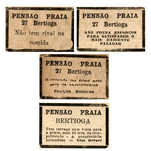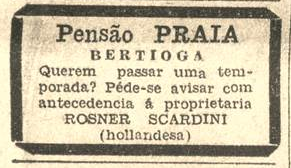 Em um anúncio do jornal A Tribuna de Santos, de 7 de abril de 1940, Elza Rosner, identificada como proprietária, faz propaganda da “Pensão Praia”. Aliás, há diversas publicações que atribuem a propriedade da “Pensão Praia” à Elza Rosner Scardini, que fazia questão de se identificar como holandesa.