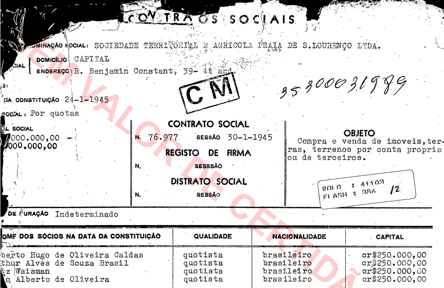 Registro na Junta Comercial do Estado de São Paulo da Sociedade Territorial e Agrícola Praia de São Lourenço (1945)