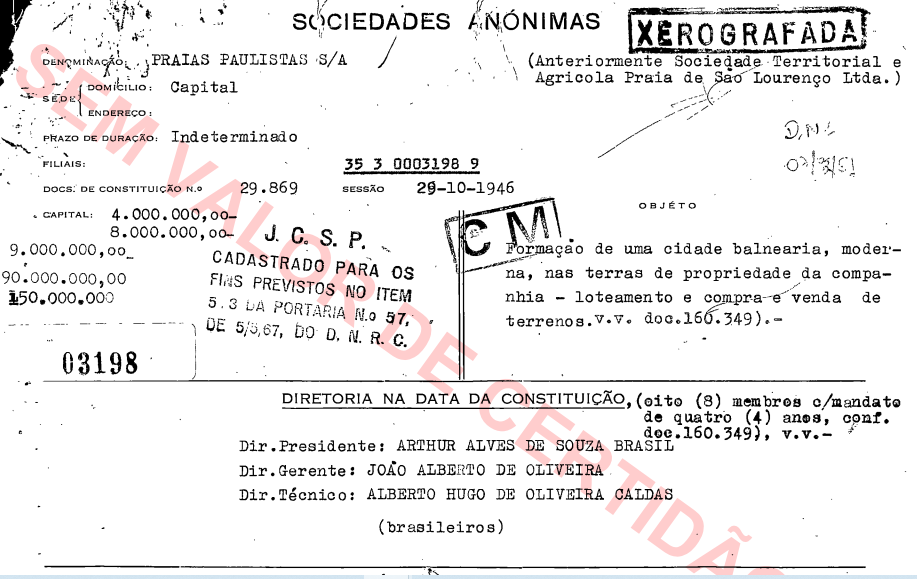 Registro na Junta Comercial do Estado de São Paulo da empresa Praias Paulistas (1946)