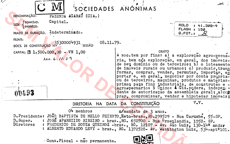 Registro na Junta Comercial do Estado de São Paulo da Companhia Fazenda Acaraú (1979)