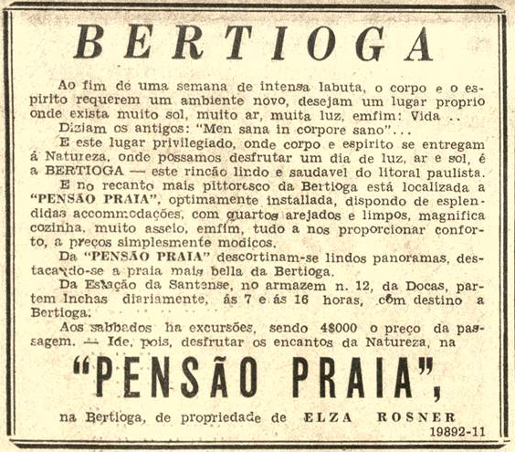E no recanto mais pitoresco da Bertioga está localizada a “PENSÃO PRAIA”, optimamente instalada, dispondo de esplêndidas acomodações, com quartos arejados e limpos, magnífica cozinha, muito asseio, enfim, tudo a nos proporcionar conforto, a preços simplesmente módicos.