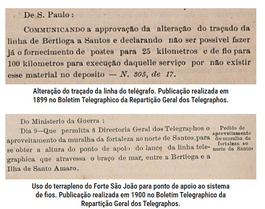 Em 1900 foi autorizado o uso do terrapleno do Forte São João para se obter a altura suficiente do ponto de apoio para que a linha do telégrafo passasse da Ilha de Santo Amaro para Bertioga, cruzando o canal.